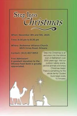 You’ll find “Bethlehem” at Redeemer Alliance Church at 4825 Innes Road, Orleans from 6:30-8:30pm on Friday and Saturday, December 4 and 5. Tours start every 15 minutes, and free parking is available on site.